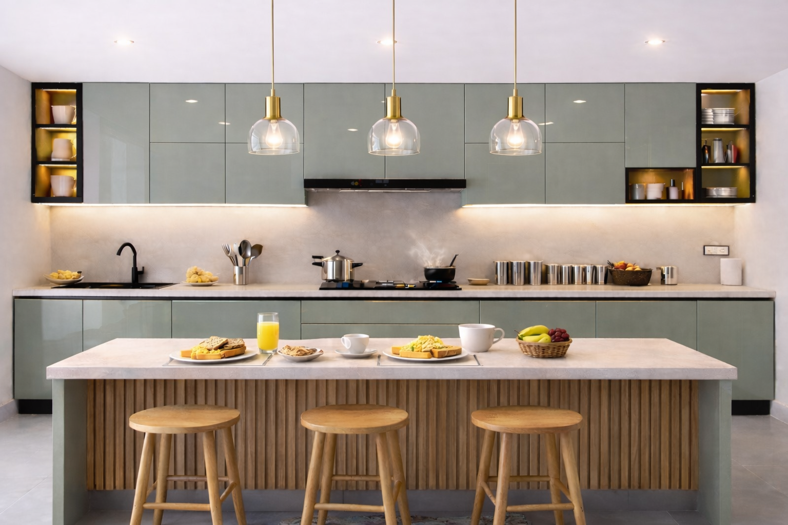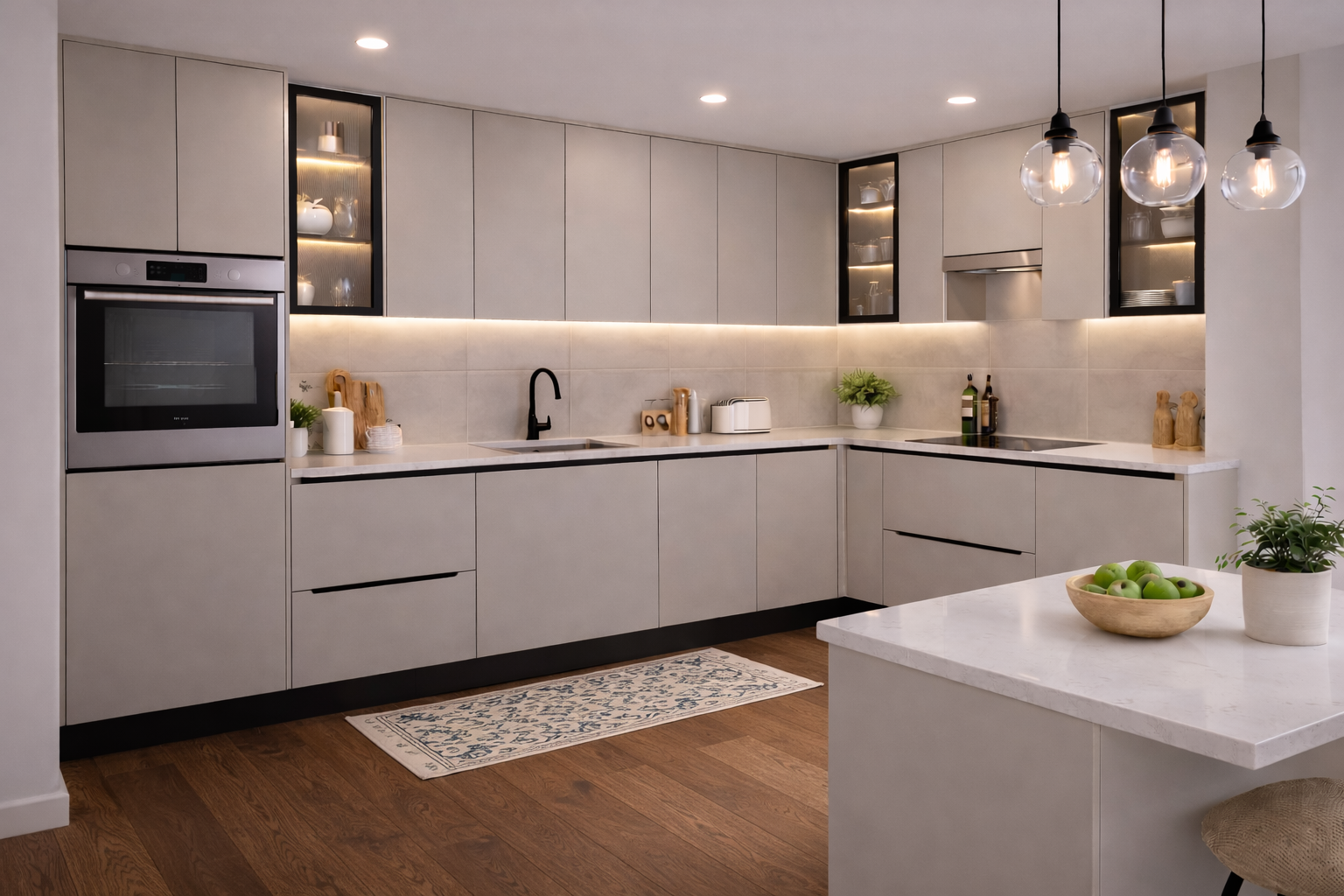 This modern functional kitchen features clean lines, ample storage, and high-quality appliances. Its minimalist design and neutral color palette create a sleek, uncluttered look, while its efficient layout and practical features make cooking and entertaining a breeze. The result is a stylish, functional space that elevates your culinary experience.