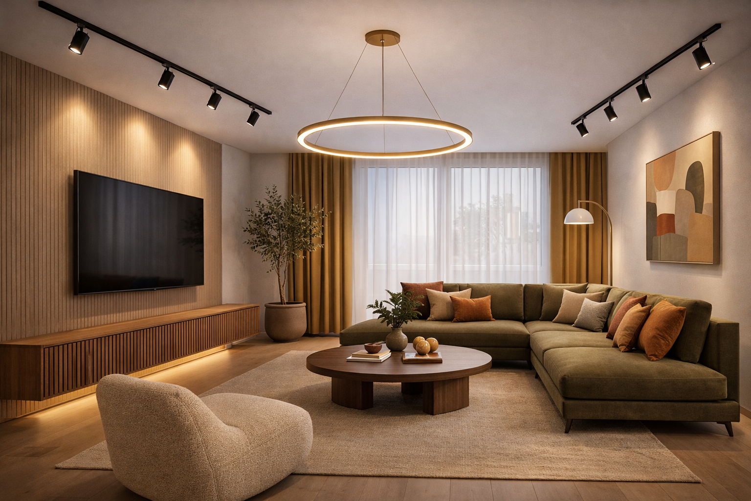 Sleek lines, minimalist design, and neutral colors define this modern living room. With a large, comfortable sofa, statement rug, and high-quality sound system, this space is perfect for relaxation and entertainment. It feels open, inviting, and effortlessly chic.